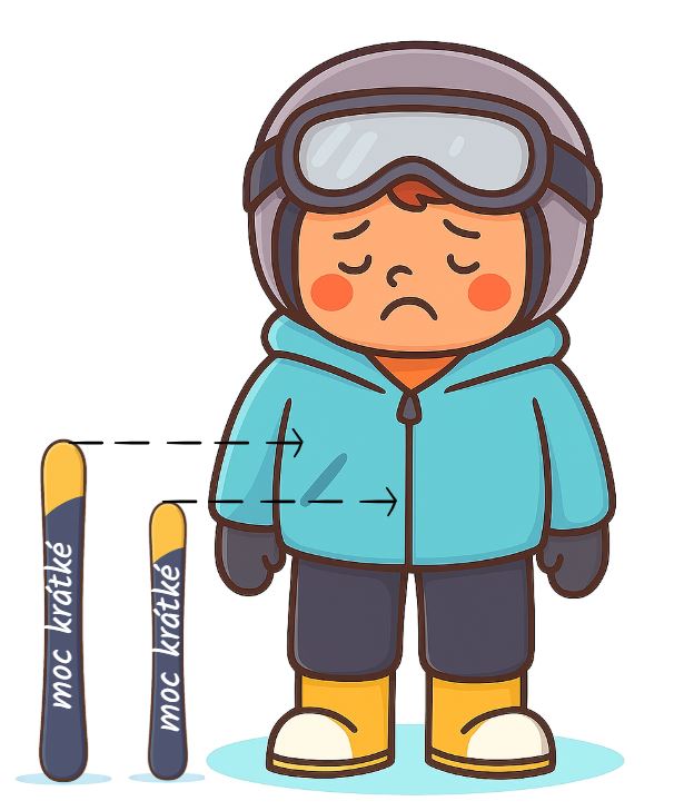 - Příliš krátké lyže (např. do pasu) umocňují přirozený záklon, dovolují dětem zvedat špičky lyží a přenášet váhu na patky. Tvorba oblouků na krátkých lyžích je spíš pomocí ramen a ne zatížením lyže - dítě zarotuje rameny a lyže, protože je odlehčena špička, zatočí. Technicky se děti na krátkých lyžích nemohou posunout dál a vznikají nežádoucí chyby (záklon, rotace), přetěžují se stehenní svaly a kolenní kloub.