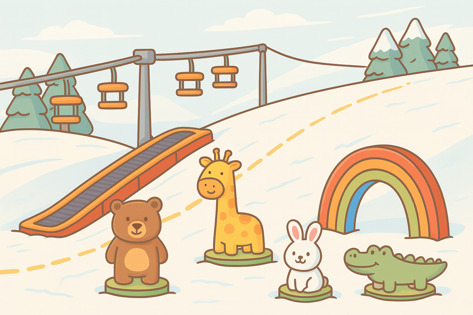 - Najdete na něm herní prvky a cvičné pomůcky (koberce, žížaly, slalomové tyčky, tunely, volanty, zvířátka, plyšáci,... to vše jsou pomůcky, které pomáhají při výuce lyžování a dělají ji nezapomenutelnou).